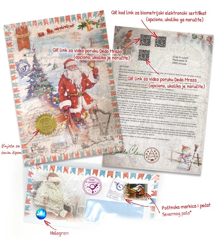 Pismo Deda Mraza je jako lepo ilustrovano i dizajnirano sa interesantnim štamparskim detaljima poput holograma i reljefnog suvog žiga.
